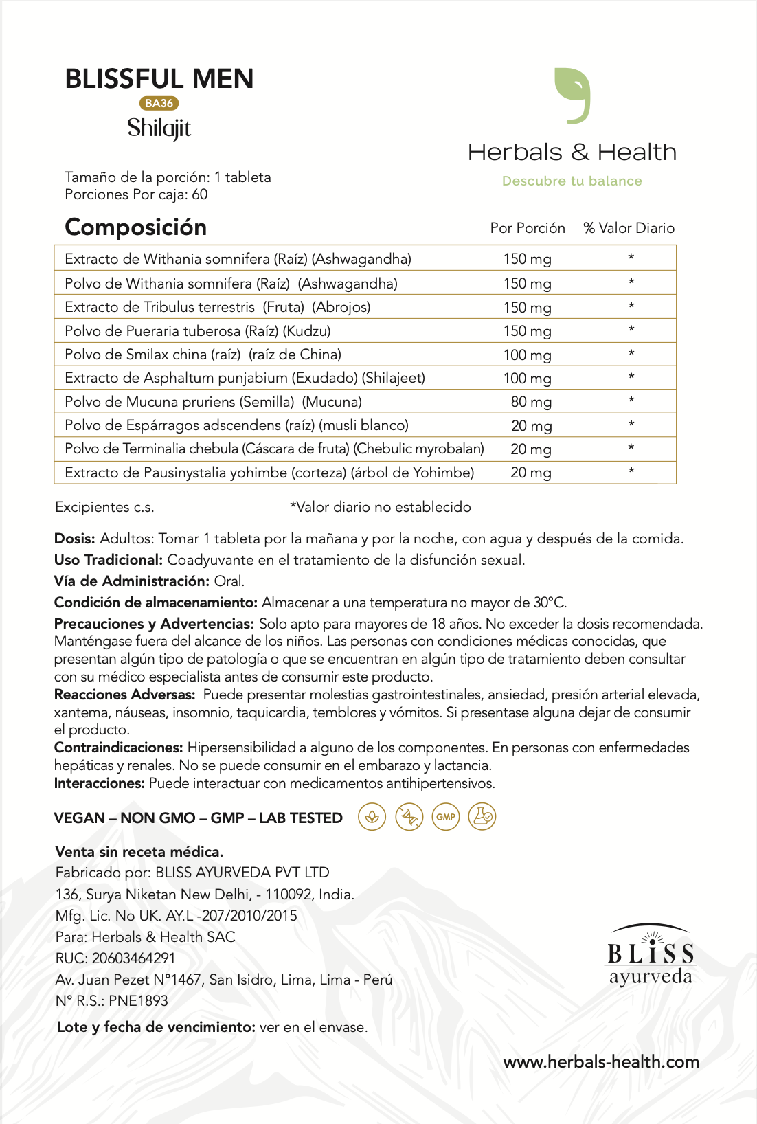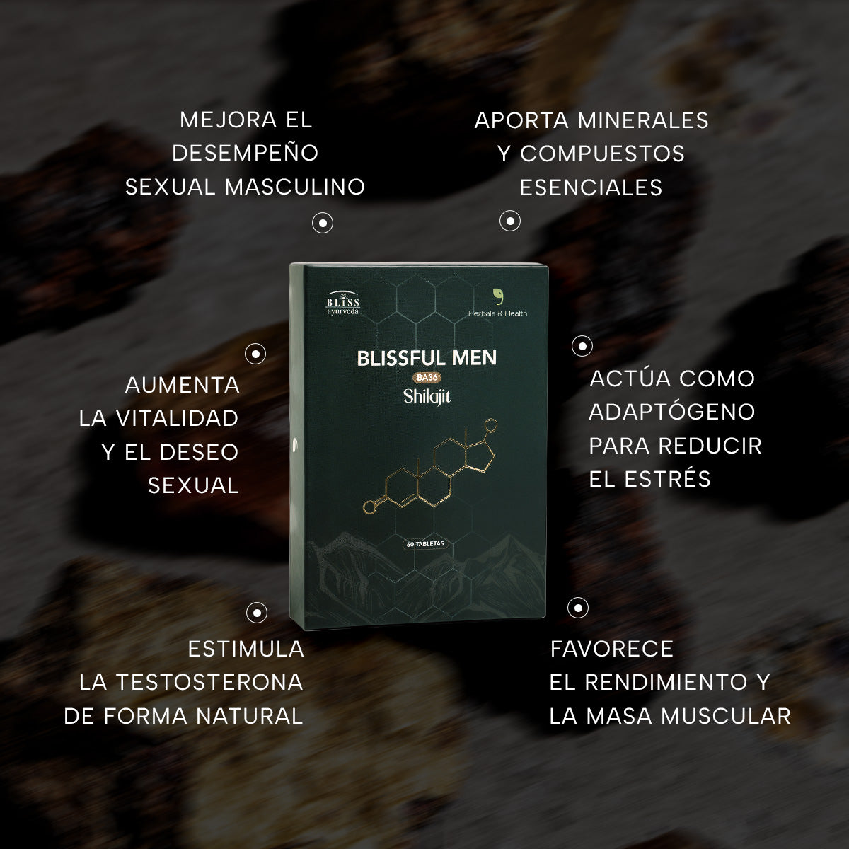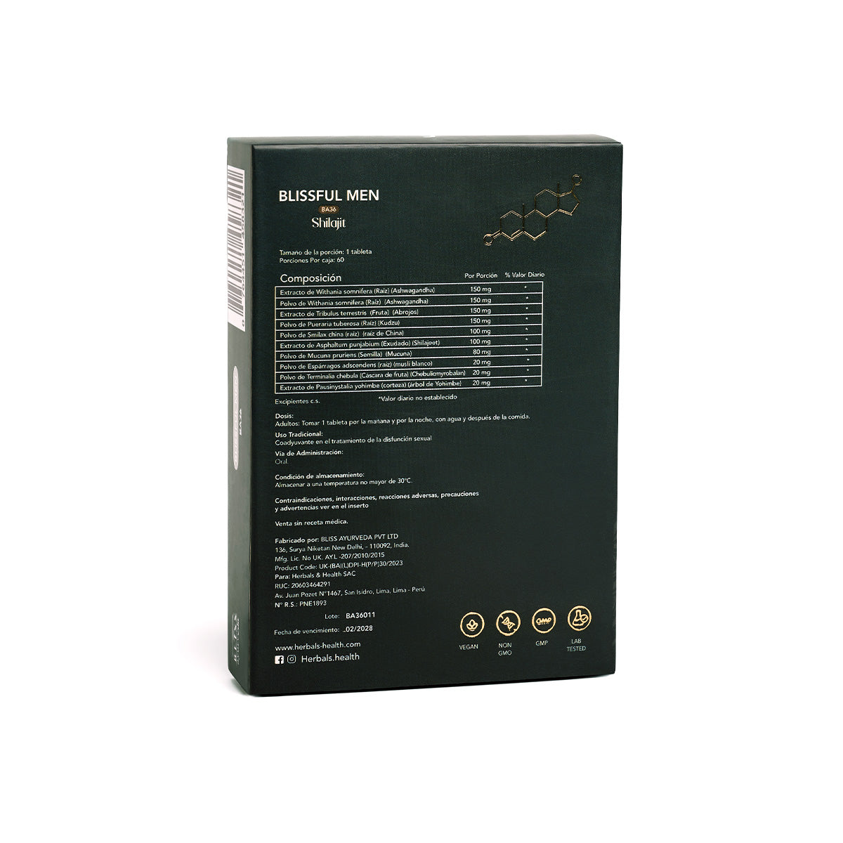 Blissful Men es una fórmula ayurvédica avanzada creada para potenciar la salud masculina. Combina raíces adaptógenas, extractos herbales y minerales esenciales utilizados tradicionalmente en la medicina ayurvédica para incrementar naturalmente la producción de testosterona, el rendimiento físico y el equilibrio hormonal.