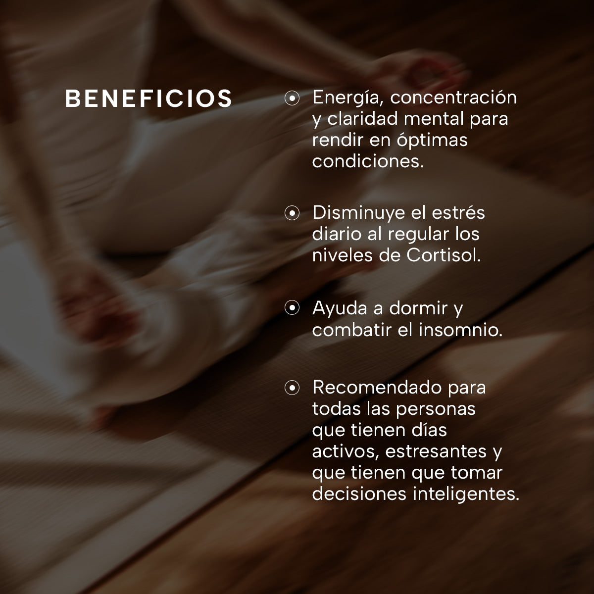 Regula los niveles de cortisol, reduce el estrés, mejora la calidad del sueño y favorece un estado de homeostasis (equilibrio integral). Suaviza el sistema nervioso y te ayuda a sostener tu energía sin agotamiento.